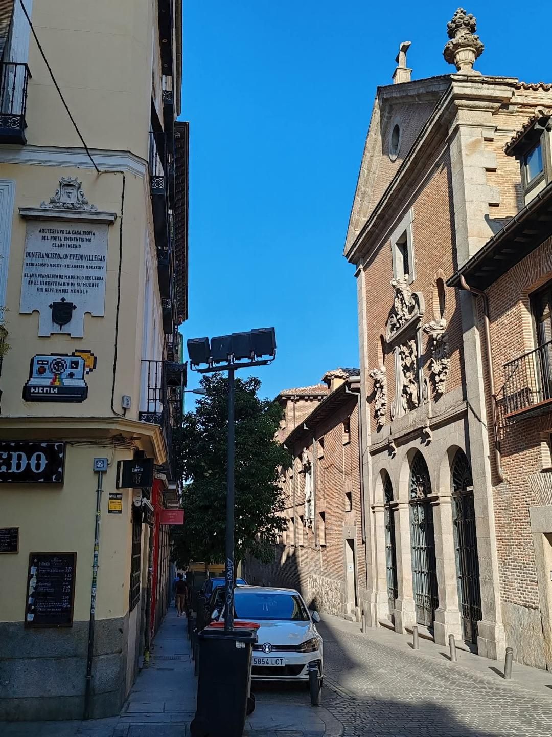 At no, 18, you will find the still-known as the Convento de las Trinitarias Descalzas or Trinitarian Convent, The Monastery of San Ildefonso y San Juan de Mata, aka Convent de las Trinitarias Descalzas has as the church built between 1668 and 1698. The convent was built between 1718 and 1752. It was initially founded in 1612 around a modest church, where the writer Miguel de Cervantes was buried in 1616. This church was demolished and the current Baroque temple was built in 1668. Work on the convent began in 1718. The small church has a Latin cross plan with a single nave. Inside, a large Baroque altarpiece is preserved. The convent also has a courtyard, cloister and cells. The complex was renovated in later years but has always maintained its sober façade. The church preserves a large Baroque altarpiece that narrates the miraculous chasuble imposed by the Virgin Mary on Saint Ildefonso of Toledo in the 7C. Since 2015, after the remains of Miguel de Cervantes were found, they rest in a monument erected in his honor inside the church, which can be visited. Founded at the beginning of the 17C, by Lady Francisca Gaitán Romero, daughter of Julián Romero, captain of the armies of Felipe (Philip) II in the wars with Flanders. Coming from the convent of Santa Úrsula in Toledo, the congregation of Trinitarians that in 1612 occupied the properties that the Romero had on calle de Cantarranas, had been provisionally installed on Calle Mayor. It is known that it was this convent that paid the ransom for Cervantes, who was captive in Algiers, and that is why, after his death in 1616, he was buried there.In the cloister, a natural daughter of Cervantes lived, and from 1621 onwards, Sister Marcela de San Félix, before taking her vows, Marcela del Campo, Lope’s own daughter like him a “woman of verses” (a codex with poetry “à lo divino” is still preserved in the convent library). The detour that the funeral procession of the Fénix de los Ingenios or Phoenix of the Sugar Mills had to take to pass in front of the Trinitarians so that his daughter could say her last goodbye from a window on August 28, 1635. Some of the furniture currently on display at the Lope de Vega House-Museum (see post) comes from this convent.