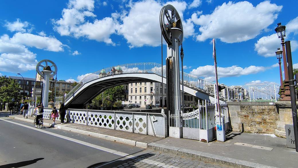 The Pont levant de la rue de Crimée or Crimée street Lift Bridge is located at the intersection of the Bassin de la Villette and the Canal de l’Ourcq. It allows Rue de Crimée to cross the canal and connects the Quai de l’Oise to the Quai de la Marne. Commissioned in 1885, the capital’s last remaining lift bridge still in operation. When the lift bridge is in operation to accommodate a boat, pedestrians can cross alongside it on a fixed, elevated footbridge: the passerelle de la rue de Crimée. This site is served by the Crimée, and Riquet metro stations on line 7 ,and the Ourcq, and Laumière metro stations on line 5.