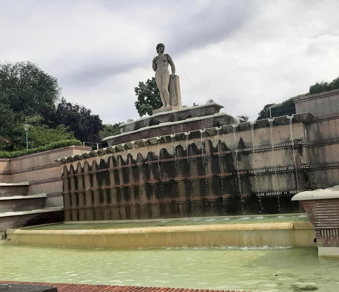 The parc de la Butte-du-Chapeau-Rouge is located in the Amerique quartier or neighborhood of the 19éme arrondissement or district of Paris, near the Boulevard Périphérique. Its name evokes a former open-air café in Pré-Saint-Gervais. This site is served by line 7bis at the Pré-Saint-Gervais metro station and by line 3b of the Île-de-France tramway at the Butte du Chapeau-Rouge station. For pedestrians, the main entrance faces the monumental fountain, between 5 and 11 Boulevard d’Algérie. Another entrance exists at 5 Avenue Debidour. Monumental fountain topped by a statue, Eve, by Raymond Couvègnes (1938). It comes from the Delessert gate of the 1937 Universal Exhibition. And the Statue The Childhood of Bacchus (1938).