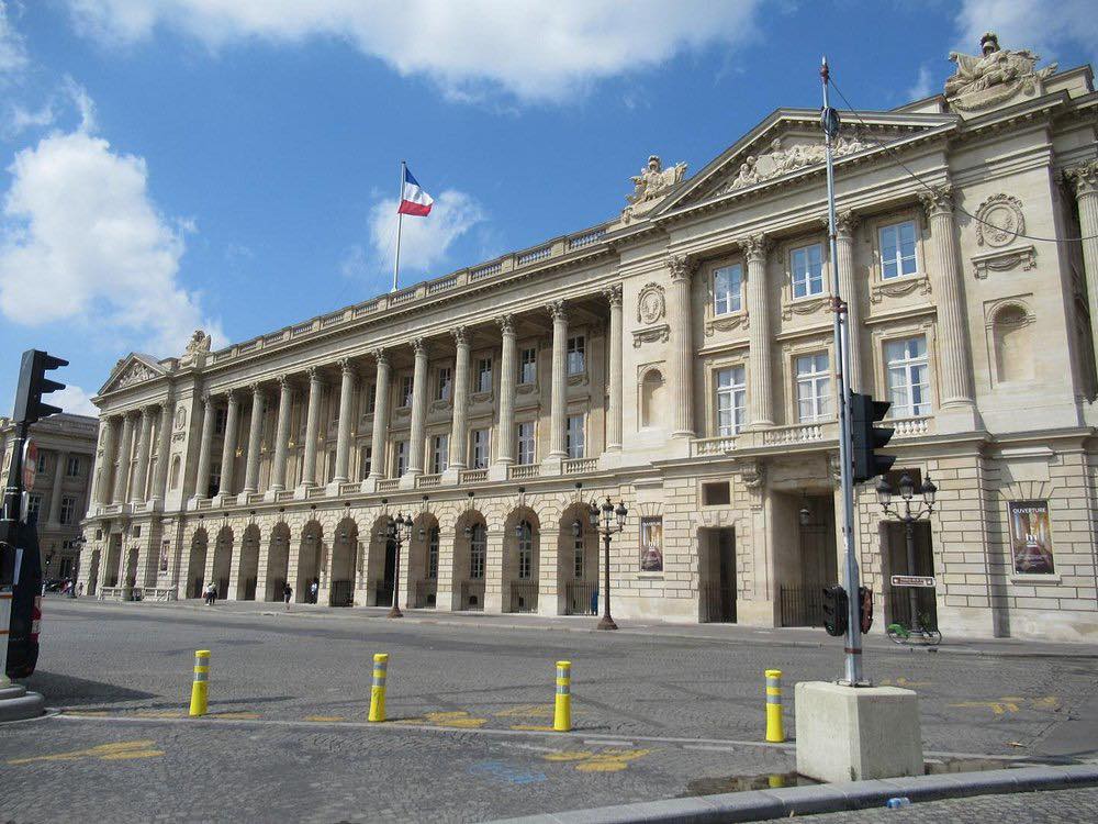 The Hôtel de la Marine constitutes the eastern edifice of a complex of two twin buildings framing Rue Royale. Its counterpart, originally intended to become the Hôtel des Monnaies is composed of four hotels: at No. 4, the Hôtel de Coislin, at No. 6, the Hôtel du Plessis-Bellière, at No. 8, the Hôtel Cartier, and at No. 10, the Hôtel de Crillon (see post). The complex currently houses the palace hotel known as the Hôtel de Crillon, the Automobile Club de France, and the Académie de Marine. The construction of the building behind Ange-Jacques Gabriel’s facades lasted from 1757 to 1774.The Hôtel de la Marine , originally Hôtel du Garde-Meuble de la Couronne is located at 2 place de la Concorde. The Garde-Meuble de la Couronne was the administration in charge of the King’s furniture.