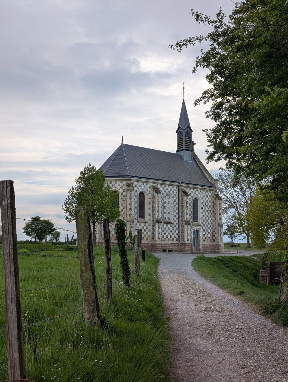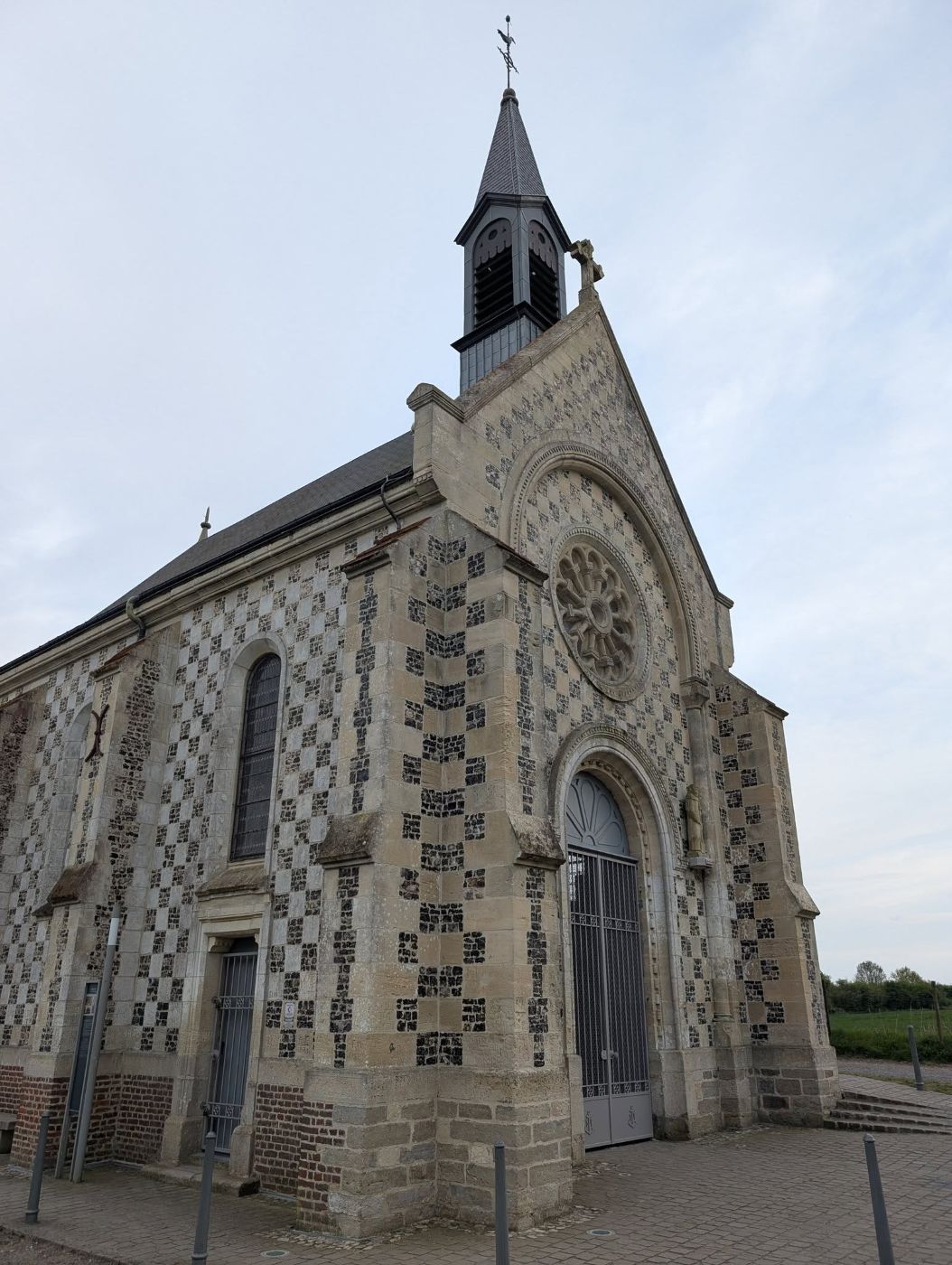 The Chapelle, dite des marins, or the Sailors’ Chapel, is located on the heights of Cape Hornu. Its very first construction was carried out in 628 by Saint Blimont on the site of the burial of Valery, apostle of Vimeu. It underwent an initial reconstruction in 1675, then was replaced by a new chapel built in 1878. The sanctuary was completely renovated in 2013 under the auspices of the French Heritage. The chapel, in the neo-Gothic style, features checkerboard walls of white stone and flint. Its bell tower is topped with a seagull. Inside, the tympanum is carved from solid wood, and numerous votive offerings can be seen on its walls. Saint Fiacre, patron saint of gardeners and farmers, is also celebrated here.