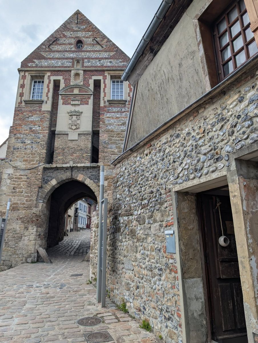 The porte Guillaume or William Gate, also called the « porte du Haut » or « porte Jeanne d’Arc » in memory of her passage through this gate in December 1430 before going to Rouen to be judged, is one of the oldest vestiges of the city. The two towers already existed, it seems, during the forced stopover of the fleet of the Duke of Normandy, William the Conqueror, in 1066, setting out to conquer England. This is where the name of the gate comes from. Joan of Arc, coming from Crotoy, crossed this gate on December 20, 1430 to go to Rouen. The complex is formed by two massive round towers, with consoles and machicolations, to which are attached two buildings with one floor and underground passages which served as guardhouses and prisons. A section of curtain wall is still visible. In summer, a pink carnation called the “crusader carnation” grows on the walls.
