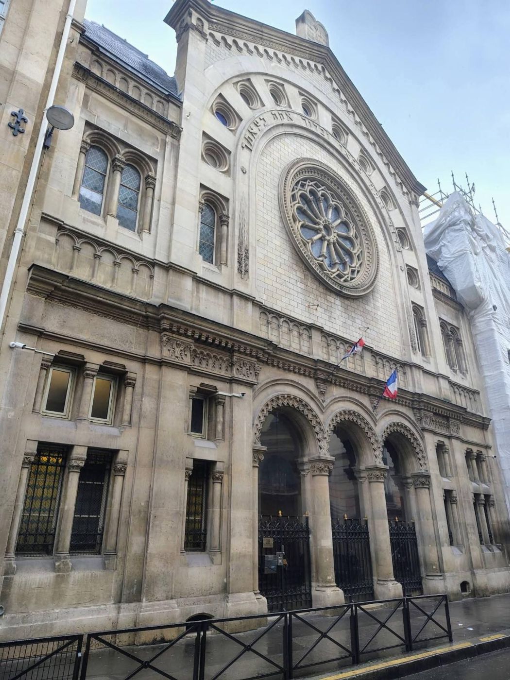 The Buffault Synagogue, located at 28 rue Buffault in the 9éme arrondissement of Paris, was built by Sephardic Jews in conflict with the Ashkenazi community, which had just built the synagogue on rue de la Victoire, later to become the Great Synagogue of Paris. In the 19C, Paris had two Jewish communities: one of German rite, primarily from Alsace and the Rhineland, and another of Sephardic rite, originating from Portugal and the Ottoman Empire. The idea arose to merge the two rites and replace them with a French rite, the Sharifath. The synagogue on rue de la Victoire, then under construction, was intended to adopt this new rite. However, many disagreements could not be resolved, such as the placement of the Bimah (the platform on which the cantor stands) in relation to the Holy Ark. The Portuguese congregants refused certain constraints. The synagogue on rue de la Victoire would therefore follow the German rite. In 1875, Jews from Bordeaux, Bayonne, the Comtat Venaissin, and the Ottoman Empire decided to build their own synagogue and created the “Civil Society of the Israelite Temple following the Spanish-Portuguese Sephardic rite.” They purchased land on Rue Buffault, not far from Rue de la Victoire. The synagogue was built in 1877 in the Romano-Byzantine style, then very fashionable in Parisian synagogue architecture.The upper part of the facade is formed by two large concentric arches, supporting a pediment crowned by the Tablets of the Law. The large Gothic rose window is located in the center of a semicircular arch. The total height of the façade from the ground to the top of the Tablets of the Law is 22.50 meters