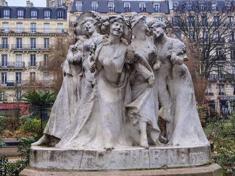 The Square Montholon is a green space in the 9éme arrondissement of Paris. It is accessible via 2 rue Mayran and served by metro line 7 at the Cadet and Poissonnière stations. It takes its name from its proximity to rue de Montholon. Covering an area of 4,571 square meters, it is enclosed by railings designed by Gabriel Davioud and includes two terraces. Two century-old Oriental plane trees, each approximately 30 meters tall, stand in the central lawn. The larger of the two, 32 meters tall and 4.32 meters in circumference, was planted in 1872. Other tree species include alders, catalpas, ginkgo trees, linden trees, paulownia trees, a weeping beech, a black locust, a goldenrain tree, and a black cherry. The square also features shrubs and flowerbeds. During excavations on the site of the future square, a complete mammoth skeleton was discovered. Construction of the square began in 1862, at the same time as the construction of Rue La Fayette. The square opened in 1863. It was part of the gardens of the private mansion of Charles Sanson, the second executioner of Paris, at a time when this quartier or neighborhood was still called “Nouvelle-France” (New France). Notable buildings here are per se statues such as between 1879 and 1884, the square housed the statue Gloria Victis, now kept at the Petit Palais. A marble group, entitled Saint Catherine of 1908 (see pic), was installed there and acquired by the City of Paris in 1925. It pays tribute to the working women of the district. The square also housed the sculpture Eagle and Vulture Fighting Over a Dead Bear, installed in 1895 and melted down during the Nazis occupation in 1942.