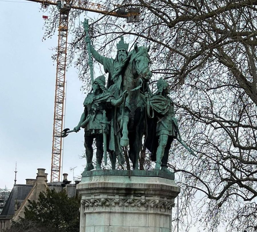 The Charlemagne and his Leudes (see below) is a monumental statuary group located in the parvis de Notre-Dame Cathedral , Place Jean-Paul-II, above the Maurice-Carême promenade and the Seine river in the 4éme arrondissement of Paris. The bronze statue depicts an elderly Charlemagne on horseback, wearing the imperial crown and holding the long scepter of Charles V in his right hand. Before him, on either side of the horse’s neck and holding its bridle, stand two of his closest Leudes: Roland and Olivier, both armed, helmeted, and wearing chainmail. Roland, looking to the right, carries the sword Durandal and an oliphant, and holds a labrys in his hand. Olivier, looking to the left, carries a dagger and holds a spear. The statue rests on a stone pedestal on one side of which is engraved Charlemagne and his Leudes. Louis Rochet, a French sculptor and Mongolian, undertook this creation after having completed the Statue of William the Conqueror in Falaise and the equestrian statue of Pedro I, Emperor of Brazil, in Rio de Janeiro. The project was presented to Emperor Napoleon III in 1853, and the statue was exhibited in a plaster version at the 1867 Universal Exhibition and in bronze at the 1878 Universal Exhibition on the stand of the Thiébaut Frères foundry. That same year, Louis Rochet died, and the plaster cast was displayed in front of Notre-Dame Cathedral. But with the fall of the Second Empire, the defeat against Prussia, and the loss of Alsace-Lorraine, the figure of Charlemagne, emperor and Franco-German unifier, was no longer welcome in the new Third Republic.The old Hôtel-Dieu buildings along the Seine having just been demolished, enlarging the forecourt (parvis), they were replaced by a square, where the statue was installed in 1882. It was inaugurated on July 14 of that same year and finally acquired by the city of Paris in 1896