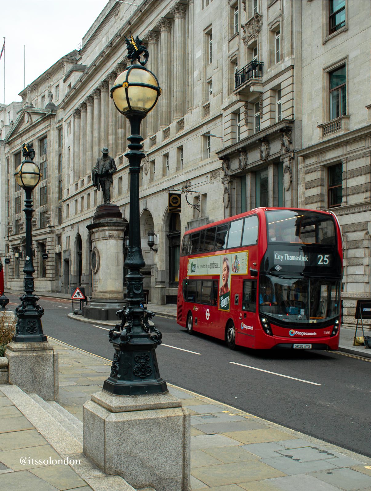 The Royal Exchange was founded in the 16C by the merchant Sir Thomas Gresham on the suggestion of his factor Richard Clough to act as a centre of commerce for the City of London. The site was provided by the City of London Corporation and the Worshipful Company of Mercers, who still jointly own the freehold. The original foundation was ceremonially opened by Queen Elizabeth I who granted it its “royal” title. The current neoclassical building has a trapezoidal floor plan and is flanked by Cornhill and Threadneedle Street, which converge at Bank junction in the heart of the city. It lies in the Ward of Cornhill. The site was notably occupied by the Lloyd’s insurance market for nearly 150 years. Today, the Royal Exchange contains restaurants and luxury shops. The third building, which still stands today, There are two statues stand in niches in the central courtyard. Charles II (a copy of 1792 by John Spiller after Grinling Gibbons’ statue in the centre of the 17C courtyard) and Queen Elizabeth I by Musgrave Watson, 1844 , The one you see in the picture is the one in front of the portico of the Royal Exchange is a statue of Arthur Wellesley, 1st Duke of Wellington, the last work of Sir Francis Leggatt Chantrey. The bronze used to cast it was donated by the government and sourced from French cannons captured during the Napoleonic Wars. It was unveiled on 18 June 1844, the anniversary of the Battle of Waterloo, in the presence of the King of Saxony , Between the Wellington statue and the exchange steps is the London Troops Memorial commemorating the dead of military units associated with the City and County of London during WWI. Designed by Sir Aston Webb, the monument is flanked by two bronze statues of soldiers and surmounted by a lion, all sculpted by Alfred Drury. It was unveiled on 12 November 1920 in the presence of the Duke of York, later King George VI.