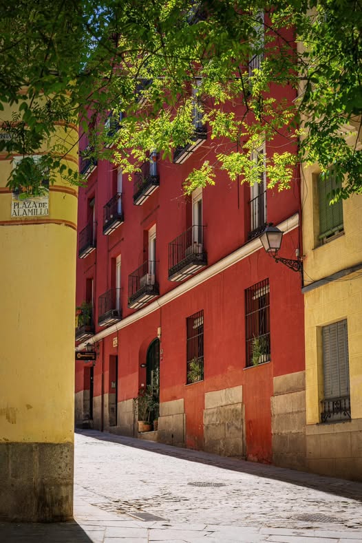 The Plaza del Alamillo has a length of 84 meters and is a small widening street to the Calle del Alamillo, a road that runs from the Costanilla de San Andrés to said square, where it meets the Calle del Toro, the Calle de Alfonso VI (see pic) ,and the Calle de la Morería. Different chroniclers agree that the origin of the Calle and Plaza del Alamillo date back to Arab Madrid, when they could have been one of the arteries of the Morería neighborhood of Madrid, where the Muslim neighbors stayed and resided since 1083, the year of the capture of Madrid by Alfonso VI. It should be noted that, with the aljama as the governing body, the Madrid Morería had its own institutional organization, different from the Christian one; Chroniclers suggest that the Arab Town Council met here during the Cordoban Caliphate of Hixén II ; after the Christianization process, and due to phonetic similarity, it ended up becoming “alamillo.” The plaza del Alamillo is an irregular square, with abundant vegetation and wooden benches. It is a small, rectangular square that preserves medieval elements. It consists of buildings from the late 19C and early 20C, built on three or more floors. The square is uneven, but is resolved with cobblestones and tree plantings.