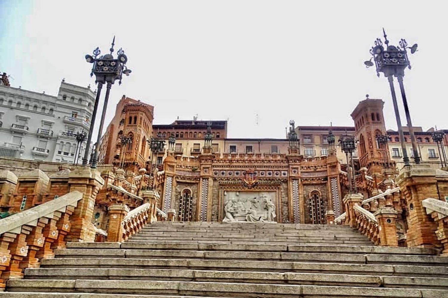 The Escalinata del Paseo del Óvalo or staircase of the Paseo del Óvalo is one of Teruel’s most emblematic monuments. It was built between 1920 and 1921 to connect the gap between Paseo de la Infanta Isabel (now Paseo del Óvalo) and the street of the Central Aragón Railway Station. With this monumental construction, it was intended to provide the city with a proper access from the station, as well as to showcase architectural and decorative elements drawn from the local Mudejar tradition and modernism. The staircase is ultimately the epitome of Teruel for the traveler arriving in the city and is currently the key work of Teruel’s Neo-Mudejar architecture.The staircase was inaugurated on June 5, 1921. Its extension runs perpendicular to the Paseo del Óvalo and overcomes the existing 26-meter gradient. The Staircase is structured in three distinct sections, connected by two small plazas. The first section begins at the station, crosses the Station Gardens or Botanical Gardens, almost without ascending, and reaches a small square with a central green space. The second section consists of seven sections that lead to a viewing plaza presided over by a large fountain and a relief dedicated to the Lovers. Finally, the third section divides into two semicircular staircases that surround the viewing plaza and end at the Paseo del Óvalo, topped by two towers.