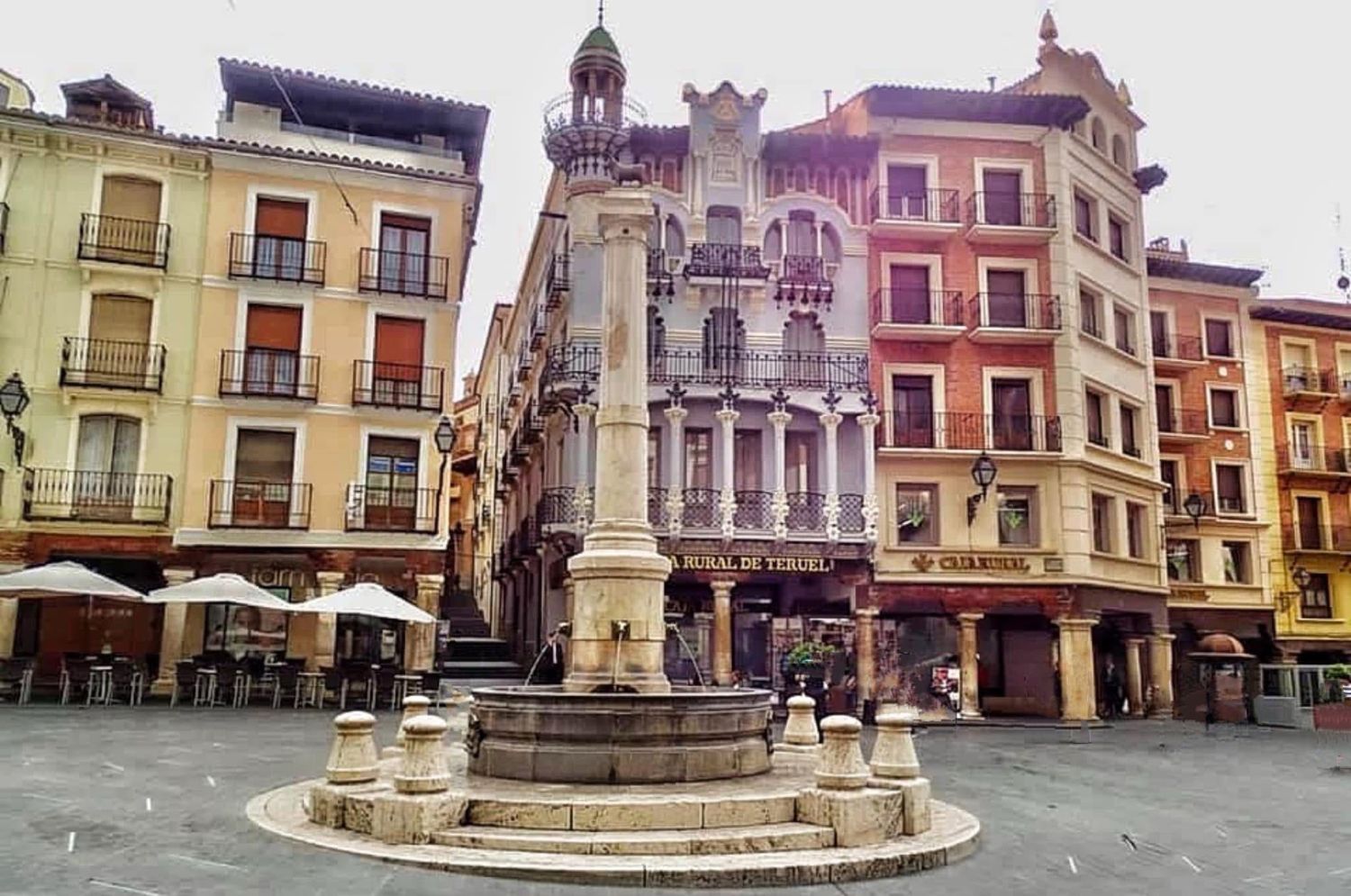 The Plaza de Carlos Castel, is the central Square in Teruel , It features a fountain with the sculpture of the Torico on a high pedestal surrounded by arcaded buildings. The buildings around the perimeter feature Modernist architecture, including the Casa Ferrán, La Madrileña, and Casa el Torico structures. The square’s central fountain, dating from 1858, supports a small bronze bull (torico) statue that has become the symbol of Teruel. This square, formerly called Plaza Mayor or Plaza del Mercado, has maintained its central position in the cityscape since medieval times. The square contains numerous shops and restaurants under covered arcades, providing shelter to visitors depending on the weather.