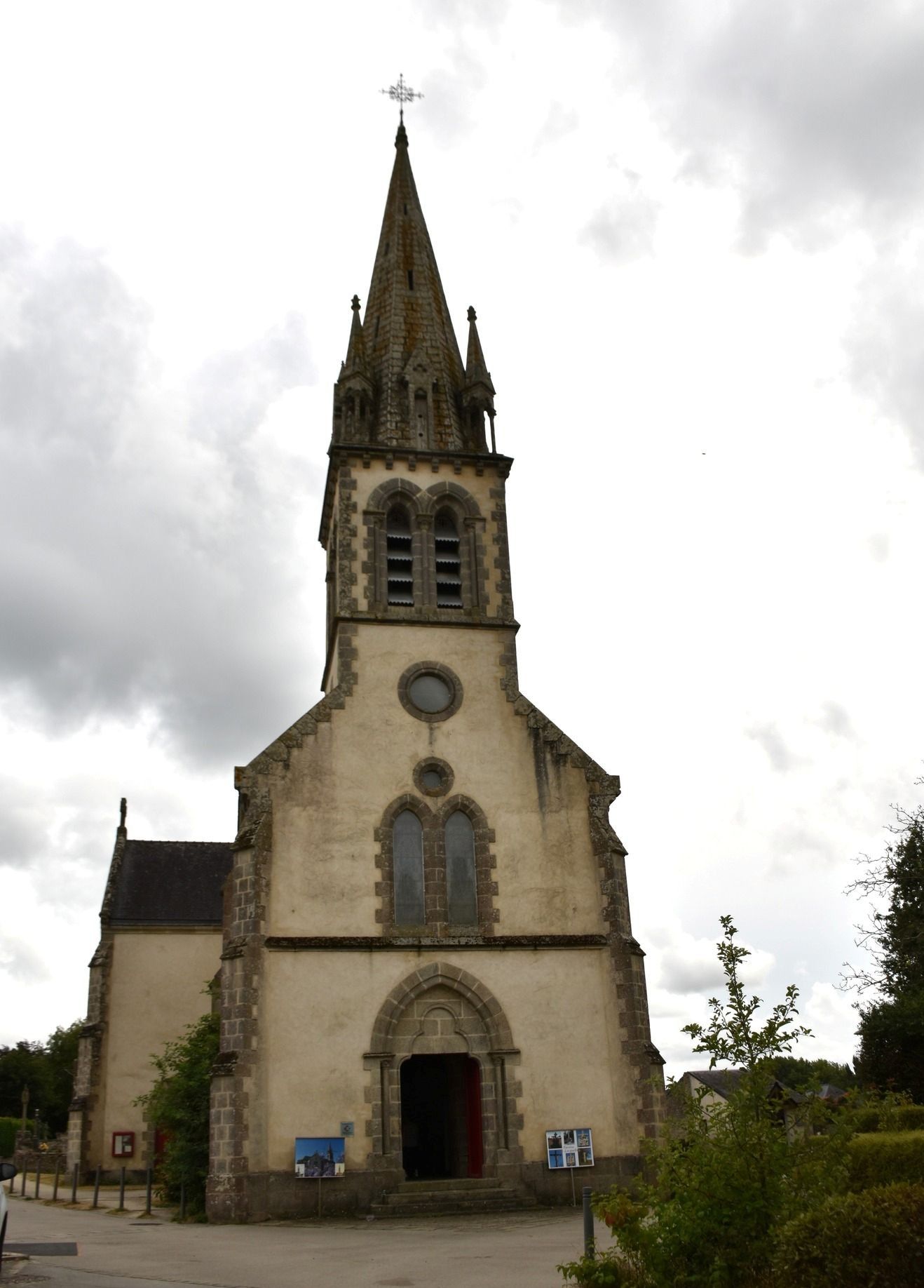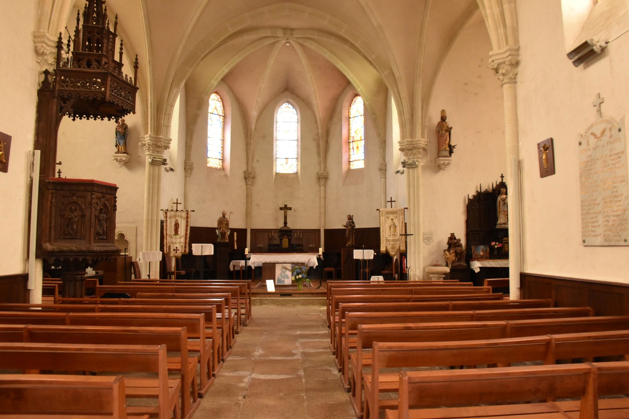 I passed and took a peek at the Church Saint Gildas done in the Gothic style to replace an older church The current church was built from June 24, 1878. The pulpit dates from the end of the 19C, The trevial church of Locqueltas had the shape of a Latin cross, and measured approximately 20 by 6 meters. Built in large and medium-sized blocks, it had basket-handle doors, pointed windows, croziers and cabbages on the gables of the transepts. The porch, to the south, dated from 1591; a slate bell tower rose at the top of the nave. This older church gave way in 1878 to a beautiful church in the ogival style, and in the shape of a Latin cross. Its windows are decorated with painted stained glass, and at the bottom of the nave rises a square tower, surmounted by a stone spire. This church is under the patronage of Saint Gildas, Abbot of Rhuys; the side altars are dedicated to the Holy Virgin and Saint Joseph.