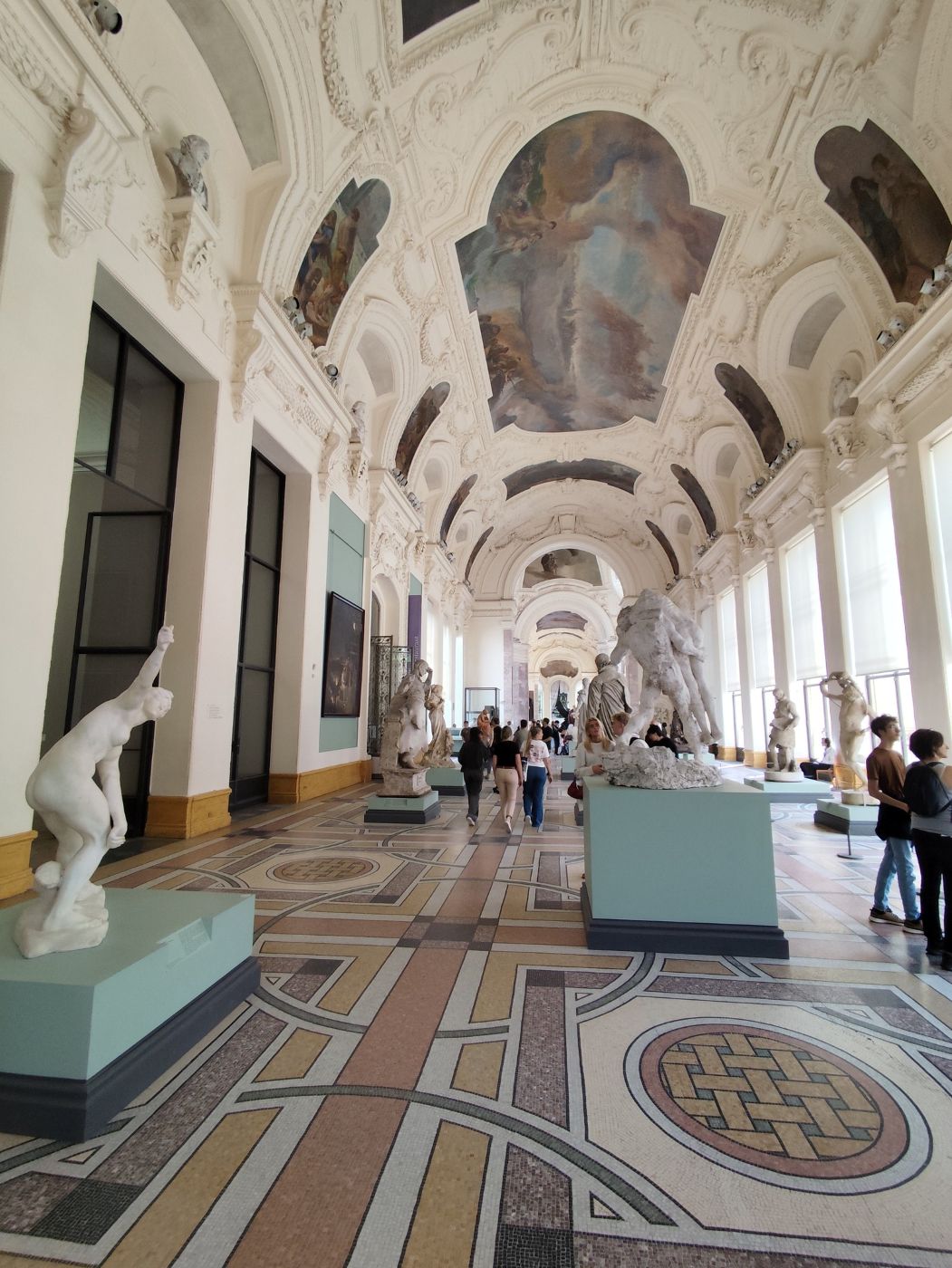 The large galleries were each tasked with decorating the vaults of the two galleries. From 1906 to 1911, Cormon retraced the history of old Paris, from the Battle of Lutetia to the French revolution (North Gallery). Roll, meanwhile, was responsible for illustrating modern Paris (South Gallery). Above the galleries are sixteen plaster busts representing famous artists, such as Eugène Delacroix, Pierre Lescot, and François Mansart.