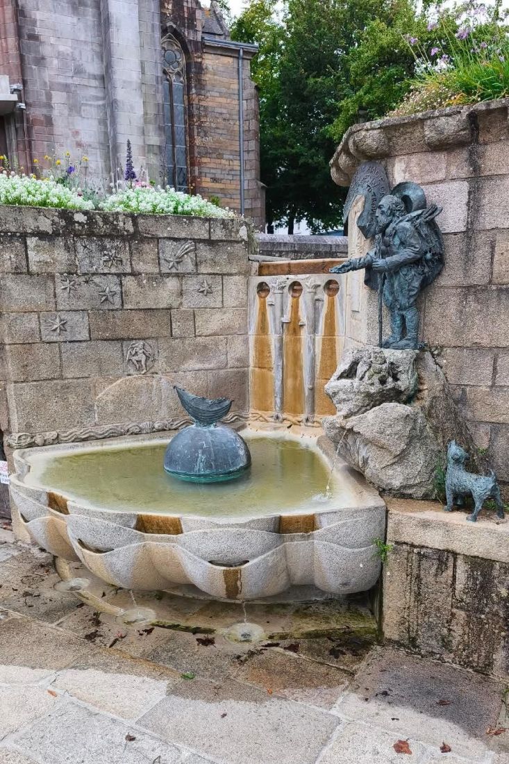 On December 22, 1990, on the fontaine de l’Imagineur ,water flowed for the first time in the scallop-shaped basin, which housed the earth, the sea, the sky, and a boat with an apple-tree mast, topped with the Moon and the Sun, now gone, like the dial’s hand. On the central square after the demolition of the covered market, today’s Place du Calvaire. The fountain expresses the essential symbolism of Plougastel as life with the world, the dual agricultural and maritime vocation of the peninsula, etc. It is also called the Pilgrim’s Fountain. The pilgrim is depicted there with his dog saying, “See the shadow, you will find the light.” The fountain is recent; its inspiration is the Way of Saint James of Compostela. A figurative ensemble laden with symbols, including two bronze sculptures: the apple tree and the imager harassed by a small dog. This is a large Breton granite basin, shaped like a scallop shell.