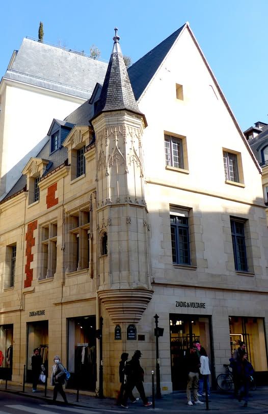 The Hôtel Hérouet,(see pic above) a small hotel on the corner of 54 rue Vieille du Temple 3éme and 42-44 rue des Francs-Bourgeois 4éme. Nearest metro Rambuteau line 11 ,and Hôtel de Ville lines 1 and 11, The Hôtel Hérouet was built around 1510-1520 in the Renaissance style for Jean Hérouet, secretary to the Duke of Orléans (the future King Louis XII) and treasurer of France. It then passed to his widow, Marie Malingre, who remarried Jean Balue, nephew of Cardinal Balue. The successive owners under the ancien régime were not distinguished, and were many. By the 19C, its ground floor had been defaced by commerce. In 1582, the hotel was acquired by Nicolas Pelloquin, secretary to the king’s chamber. Following his bankruptcy, the hotel was seized in 1621 and split into two lots during the sale. Occupying the left side, the Turret House was owned by Jean-Baptiste Brunet de Chailly, advisor to the king, who also owned the Hôtel d’Albret, In 1908, the City of Paris became the owner and modified the alignment along Rue Vieille-du-Temple to preserve the turret. Originally, the facades were clad in bricks decorated with red and black diamonds, while stone was used for the base, the chainwork, and the mullioned windows. The corbelled corner turret lends the house a great deal of charm. Resting on a console, it is sculpted with flamboyant Gothic decoration. Restored at the end of the 19C in the troubadour style, the building was unfortunately badly damaged by the bombings that took place in Paris from 26 to 27 August 1944. It was almost entirely rebuilt in the 1970s, with the exception of its turret, which remained intact.