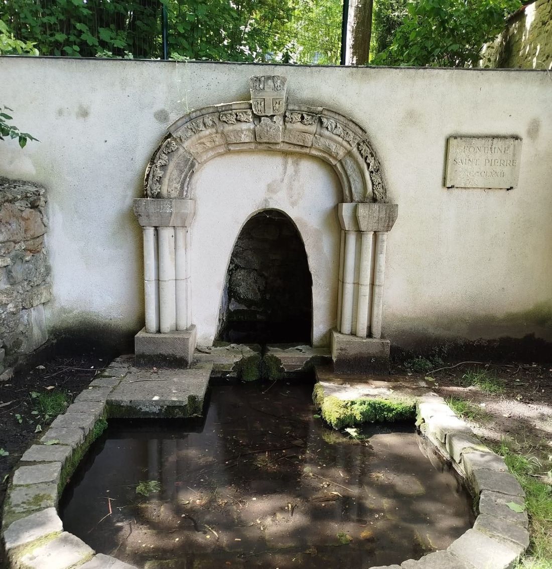 The fontaine Saint-Pierre fountain It is located next to the city hall roundabout. Its original location, as could still be seen at the beginning of the 20C, was in the park of the castle, now the town hall. It is surmounted by the sculpted coat of arms of the Montaigu, the first Lords of L’Étang-la-Ville, as well as the date “1372”. This fountain was subsequently destroyed during the construction of the buildings of the Parc residence. The pieces, collected by the village residents, allowed the Stagnovillois Defense and Protection Committee to reconstruct the original fountain, with the help of the stonemason school of the Paris chamber of apprenticeship. It was erected in its current location by the village on October 26, 1985.