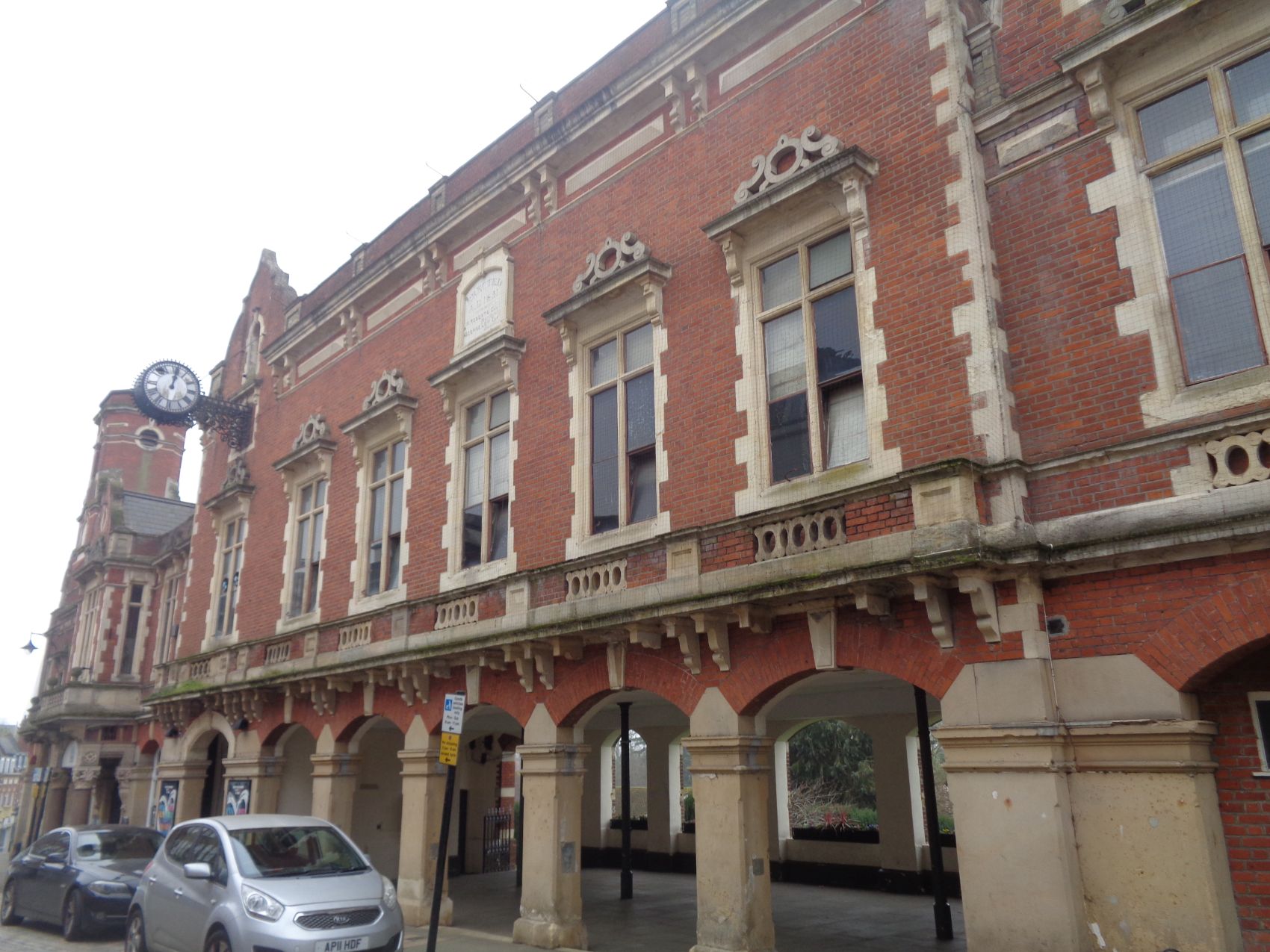 A market place was established in the old town under a charter awarded by Henry VIII in 1539. By the early 19th century the market hall took the form of a long range of corn lofts, which stood on pillars, so that markets could be held underneath. A courtroom was established at the north end and a town hall was erected at the centre of the structure in 1825 the old structure were demolished in 1851. and the new building that is the central section of the current structure was designed in the Jacobean style, built with red brick and stone dressings and completed later that year The design involved a symmetrical main frontage with five bays facing onto the High Street; the middle bay featured a portico with Corinthian order columns supporting a balcony and a bay window on the first floor with a gable above ,The new building was extended to the north along the High Street, with arcading on the ground floor, to create a corn exchange in 1861 with a four-stage tower which included an octagonal upper stage, to create municipal offices in 1868 ,The town hall continued to serve as the headquarters of the local municipal borough council for much of the 20C, but ceased to be the local seat of government after a new civic centre, was completed in 1966.] Instead the town hall was used for theatre performances from 1978 and was refurbished for use as an arts centre in 1986