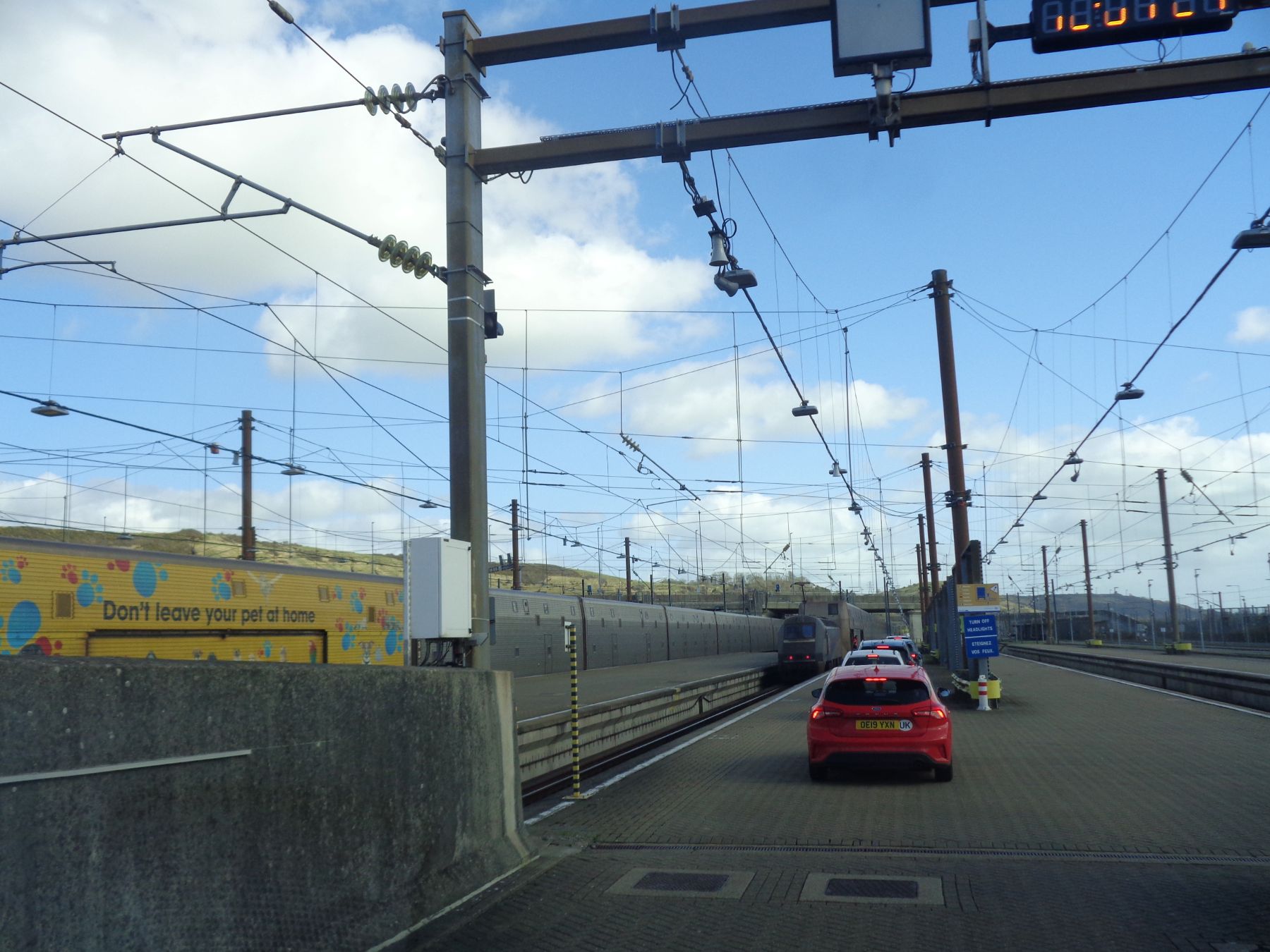 We took off late at night for an entry very early morning catching practically the first train shuttle with my Ford;my good boys and our wonderful Rex;the dog travels too and he love it !! LeShuttle or eurotunnel is near Calais at Coquelles, exit 42b of the A16 autoroute/motorway takes you directly to Check-in, Once in England the speed Limit is 60mph (96kph), rising to 70mph (112kph) on motorways. Speed limits are lower on other road types. Yes going down to 30 mph and plenty of radar cameras all over wow !!!