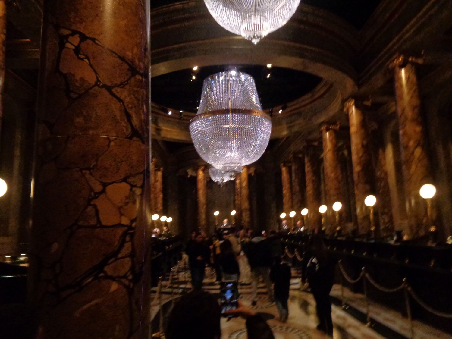The Gringotts Wizarding Bank played an important role in the Harry Potter film series. Lined by towering marble pillars, the grand banking hall is decorated with three magnificent crystal chandeliers and finished with real brass leaf. Inkwells, quills, ledgers and piles of Galleons, Sickles and Knuts complete the goblin tellers’ desks as seen on screen
