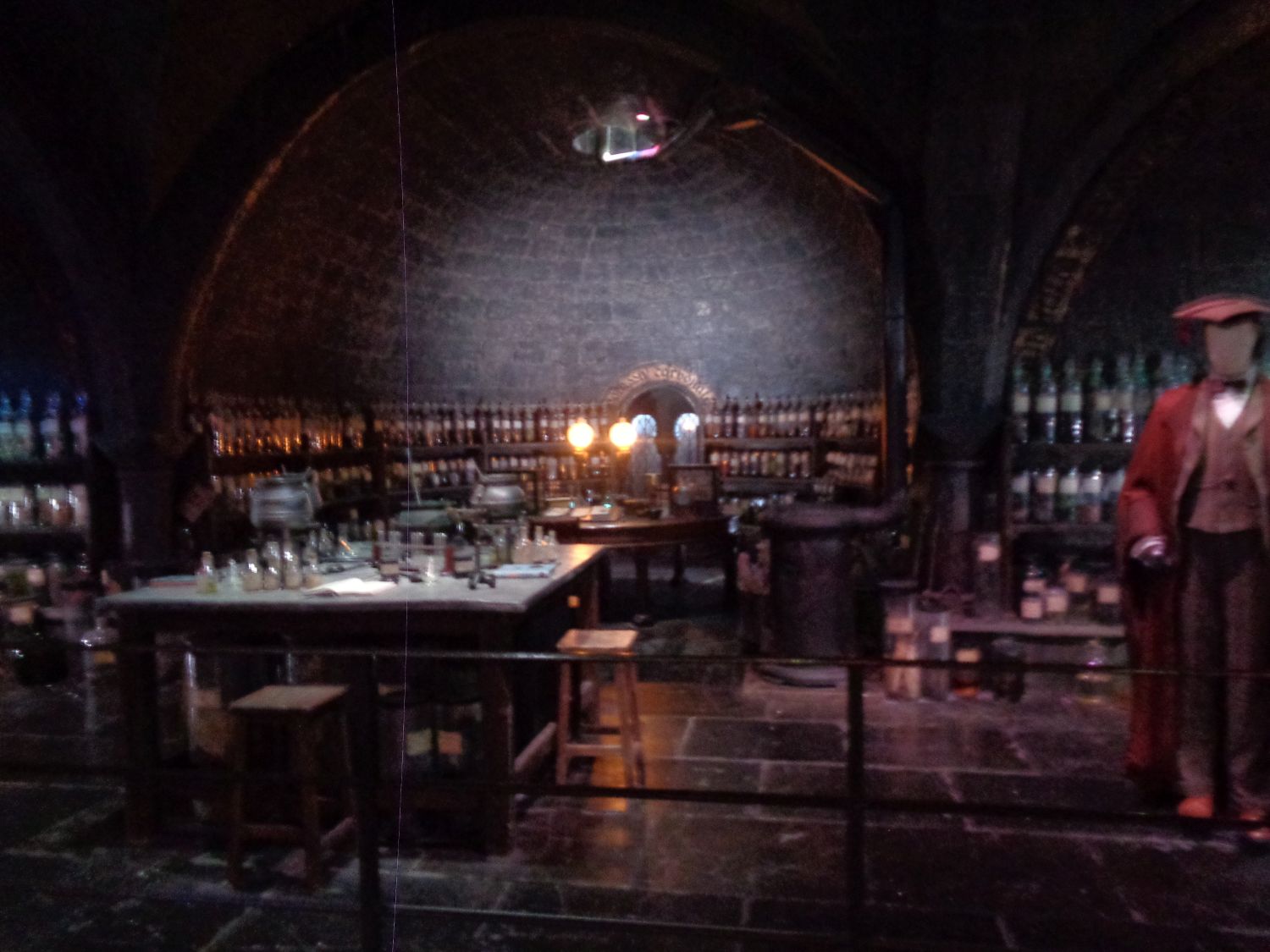 The Apothecary’s Shop is a shop located on Diagon Alley, specializing in the ingredients needed to make potions. It is the shop where the trio gets their supplies. Barrels filled with slimy substances line the floor. Jars filled with herbs, dried roots, and glittering powders are arranged on the shelves. Bird feathers, snake fangs, and raptor talons hang from the ceiling. The shop also sells unicorn horns and beetle eyes. The Potions Classroom has over 950 potion jars line the walls of the classroom, each with unique props kept inside them including baked animal bones from a local butcher shop, dried leaves, herbs and shrunken heads made by the props department