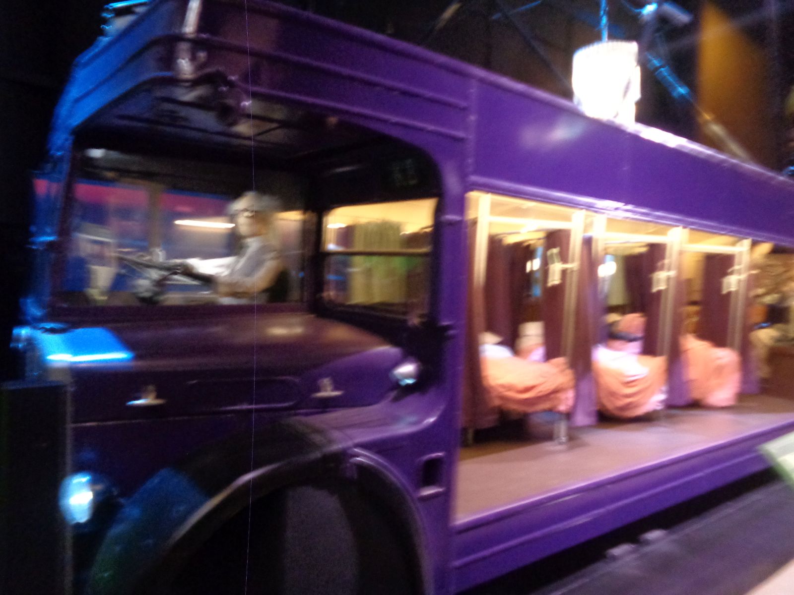 The Knight Bus is a magical bus driven by Ernie Danlmur and controlled by Stan Shunpike. It is invisible to Muggles. To summon it, one simply has to stand on a sidewalk and wave their wand. It is a purple double-decker bus that travels at 200 km/h (124 mph) through the streets. It has mismatched chairs and armchairs during the day and copper beds at night. As it travels by bouncing from one destination to the next, it is not particularly comfortable.