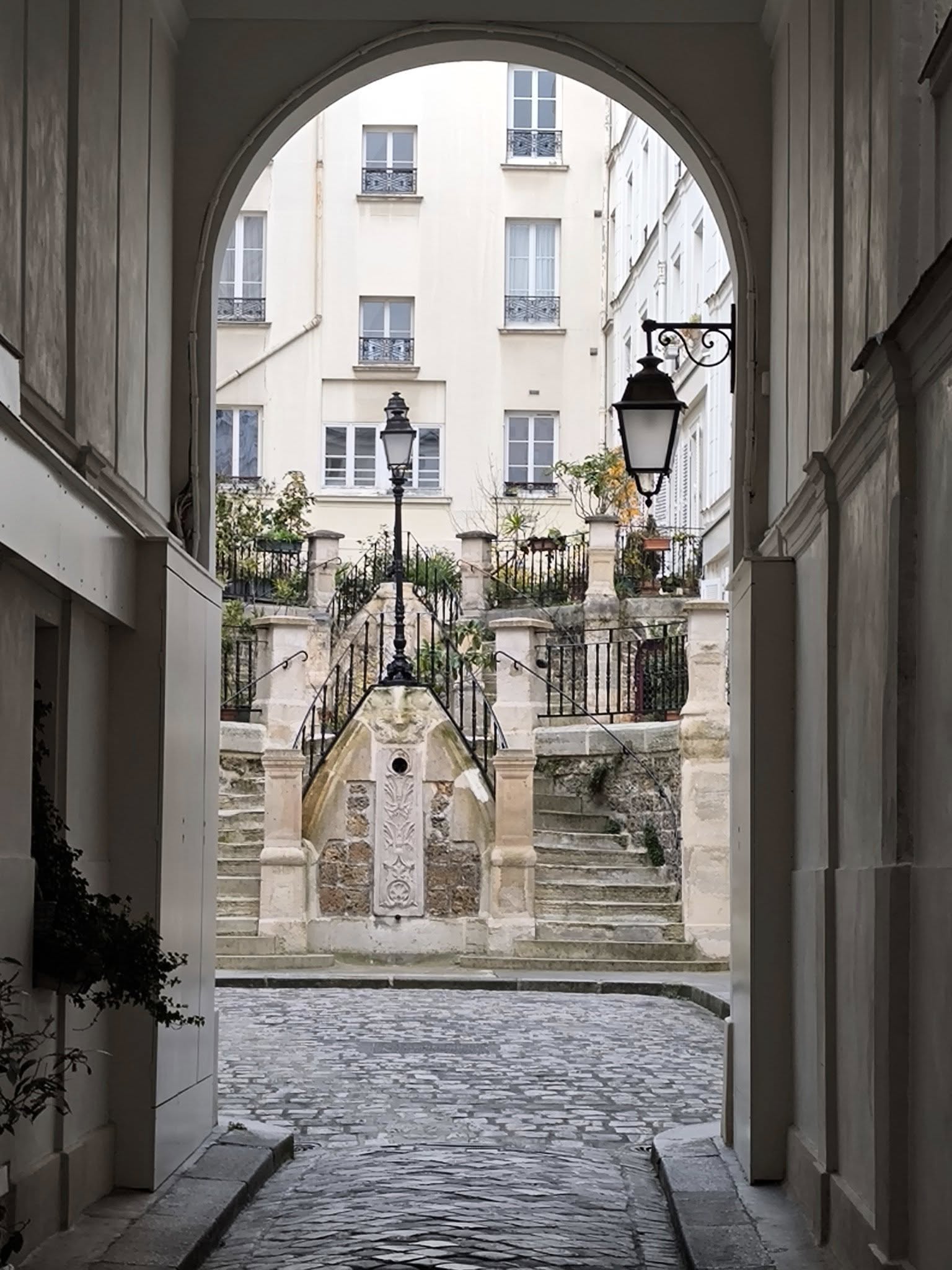 The Rue Durantin is located in the 18éme arrondissement of Paris ,and in the Montmartre quartier or neighborhood, bordering the Grandes-Carrières quartier. It is one of the few streets on the Butte Montmartre that does not go uphill. Its name comes from the former owner of the street, the historian and novelist Armand Durantin. Following two consecutive expropriations under the influence of Patrice de Mac Mahon, Armand Durantin paid for the entire construction of a wall on the street, and the city, therefore named this street “Rue Armand-Durantin”. First of all, we must differentiate between the old rue Durantin, which was created before 1672, and the current street, whose name dates back to 1881. The current Rue Durantin was formed by the union of the old rue Durantin (starting at rue Ravignan and ending at rue Garreau), rue Bastien (between rue Garreau and rue Tholozé), and the passage Masson (surplus extending to rue Lepic). Notable buildings here are the Spanish painter Ignacio Zuloaga lived on rue Durantin in 1890. In the same year, he resided at various times in rue Cortot and rue des Saules. At No 1, the painter Charles Maurin lived there. Stéphane Mallarmé settled here for a time upon returning from military service in December 1877. The poet Lautréamont lived at No 7. Henry-Eugène Delacroix had a studio there in 1907 at No 20. The painter Georges Delaw had his studio, topped with a large glass roof, until 1934. At No 40,(see pic) inside the buildings, lies a stunning two-level courtyard with a horseshoe staircase. The building offers a glimpse through a gate into one of the most astonishing courtyards in Montmartre. Due to the steep slope of the hill, the courtyard is arranged on two levels connected by picturesque double-spiral stone staircases, decorated with a fountain. It is decorated with flowers and retains its old, dented paving stones. During WWII, the inhabitants of this courtyard suffered a tragic fate. At the time, the Butte Montmartre was home to a number of Jewish families. The Jewish families living in this courtyard were rounded up and taken to the Vel’ d’hiv, before being deported and exterminated in the death camps. For this reason, the place is often called the “Jewish courtyard.” At No 43, the painter Fernand de Launay lived and died there in 1904. At No 48, the painter Émile Beaudoux lived there in 1898. The painter Pere Créixams owned the studio. At No 52, the painter Jean-Paul Riopelle had a studio there for three years.