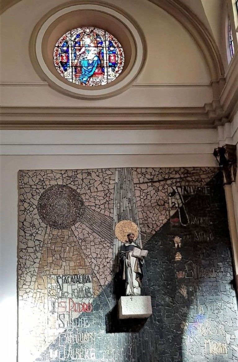 The façade is in the Herrerian style, imitating the religious architecture of the 17C. As a result of the poor condition of the pre-existing buildings, the new oratory church adopted the canons of Madrid’s Baroque architecture, resulting in a church with three naves separated by pillars with attached pilasters. The main nave is covered with a barrel vault with lunettes and the lateral naves with groin vaults. The transept is crowned by a small dome without a drum. These Baroque vestiges are nuanced in the sober main façade, made of brick in an eclectic style, mixing Renaissance elements such as the Serlian window with other neoclassical or Baroque elements. The altars and decoration are mostly contemporary, although two important old works have been preserved: firstly, the Christ of the Olive Grove, a Baroque sculpture that presides over a modern altarpiece made of unpolychromed wood. It was burned down along with the church in 1936 during the Spanish Civil War, and replaced by the current statue, The other great work of art housed in the oratory is the Virgin of the Rosary. The carving shows Mary seated on a throne, holding the Child on one of her knees, the two surrounded by a glory of child angels and cherubs among clouds, carved with great care. The work comes from the now-disappeared convent of Santo Tomás. Touring the church from the Epistle side, we pass three niches housing modern images of Saint Anthony, Our Lady of Fatima, and Saint Catherine of Siena. In the transept on this side, we see an image of Santo Domingo de Guzmán (Saint Dominic) above a large mosaic depicting the most important saints of the Dominican order.