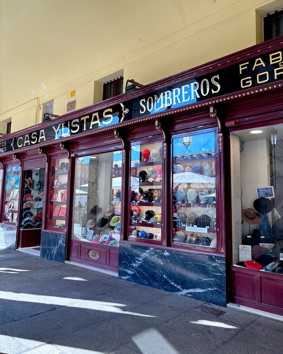 Casa Yustas,Plaza Mayor ,30 corner with Calle de Felipe III, perhaps you passed by without noticing after all the commotion in the square, but do really do go in. I shop for my grandparents for their hats here and now my sons buys caps !! Founded in 1886, Casa Yustas is the leading hat shop, specializing in all types of hats, from classic and vintage styles to more modern and alternative styles, also accepting custom orders. This century-old establishment also offers a wide selection of gift items, home decor items, and military-themed items.