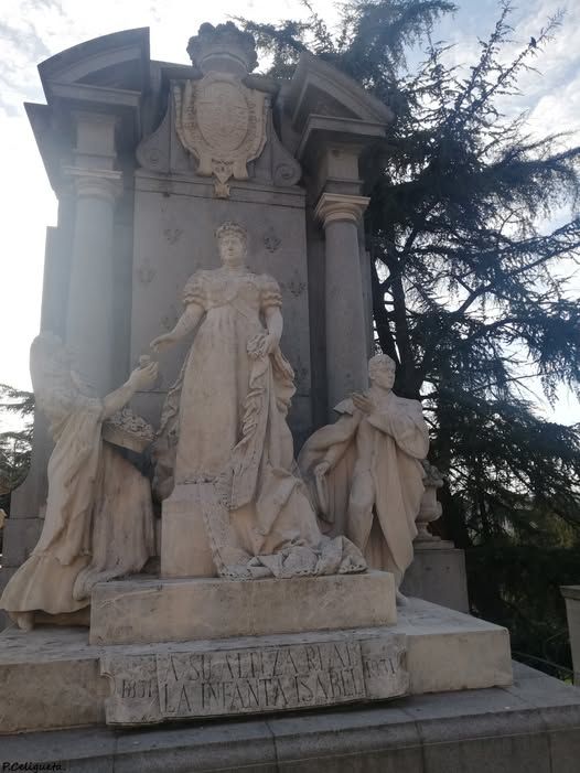This monument to the Infanta Doña Isabel de Borbón, was proposed by the Royal Academy of Fine Arts in 1951 to the then mayor of Madrid, Count of Santa Marta de Babio, to commemorate the centenary of the birth of the Infanta Isabel de Borbón y Sajonia, Princess of Naples,and twice Princess of Asturias, popularly known as “La Chata”. She was the daughter of queen Isabel II and Francis of Assisi of Bourbon.She married Gaetano of Bourbon-Two Sicilies, Count of Girgenti, son of Ferdinando II, King of the Two Sicilies; they had no children. The monument was installed near one of the entrances to the Parque del Oeste on Paseo del Pintor Rosales which was at the end of Calle de Quintana ,where her old palace is still preserved. Work on the monument, began in late 1953 and was completed in April 1955. On either side of the sculptural group stand two limestone vases, and behind them, a large granite wall studded with fleurs-de-lys, flanked by two Tuscan columns by a broken curved pediment, framing a large crowned coat of arms of the Royal House of Bourbon, a rectangular plaque containing a large “Y” for “Ysabel” (according to the old spelling) between two also oval coats of arms: one with three fleurs-de-lys of the Bourbons, and the other with the bear and the strawberry tree, of the Madrid City Council. Figures on either side, on a lower step: a flower girl holding out a rose to the honoree, and a caped Castizo doffing its Cordoban hat to present it to the onlooking public. The inscription at the foot of the pedestal and in incised letters on a mock stone phylactery reads1851 /to her Royal Highness /the Infanta Isabel / 1931.