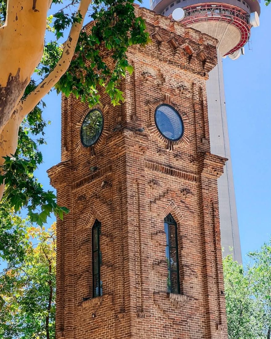 The Casita del Reloj or Clock House, is the former guards’ pavilion integrated into the mansion on Quinta de la Fuente del Berro, it houses the “Rafael Altamira” cultural center. The single-story building has a surface area of 80 m², of which 66 m² are usable. It is a Mudejar-style brick construction attached to the wall of the entrance to the Parque de la Fuente del Berro on Calle de Enrique D’Almonte, 1, and is part of the former mansion. In the distance you see the Torrespaña tower of Spain commonly call the El Pirulí given to Calle de O’Donnell, 77, This is the RTVE (Radio and TV of Spain) communications tower is one of Madrid’s icons and a landmark of its skyline in the northern part of the city. Standing 220 meters tall, several television and radio stations broadcast from this center.