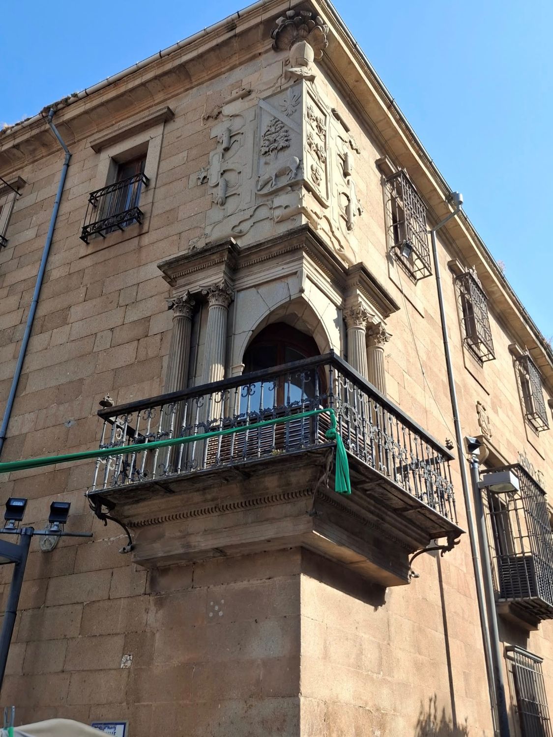 The Casa Palacio del Deán,(see pic) in the plaza de la Catedral ,look like the same building but are two different buildings, although they were joined at the beginning of the 20C to become the seat of the Palace of Justice. Both are contemporary. The Dean’s House, built in the 17C in a neoclassical style, has the most emblematic corner coat of arms in the city and belongs to the Paniagua and Loaisa families, with five roses that give rise to the Loaisa surname, and the sow under the holm oak and the fleur-de-lis of the Paniagua surname. The Doctor Trujillo House,,next, attach is a mixture of two architectural styles, Plateresque and Gothic, was built between the 14C and 16C. In the upper part, there is a gallery with six arches, and on the ground floor, it preserves the beautiful ironwork of the time. Its name comes from the archdeacon of Trujillo, Alfonso Fernández de Medina, who lived there in the 15C.