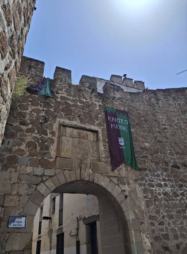 The walls of Plasencia have protected the old town since the time of the city’s founding, allowing access to the old town only through its gates Next to the walls there are notable buildings such as the Lucía Tower, a tower on the top of which a bonfire was once lit at night, used as a beacon for walkers approaching the city. It was built at the end of the 12C for defensive purposes, its main promoter being Alfonso VIII of Castile, who founded the city in 1186 to defend both its southern border with the Andalusian territories and its western border with the Kingdom of León. Given the imprecision caused by the current state of conservation, with large fragments of the wall lost, it can be said approximately that the cartographic surface occupied by the walled enclosure was 26.71 ha and its perimeter 2.44 km, not including the barbican and cubes. The gates and wicket gates are, starting from the north and going clockwise: the Fortress Gate or San Antón Gate (now disappeared), the Santiago Gate, the Carro Gate, the Sun Gate, the Clavero Gate, the Talavera Gate, the Santa María Gate, the Trujillo Gate (now the Cañón de la Salud), the Coria Gate, the Berrozanas Gate and the Salvador Gate. These entrances are still used to enter the central area of Plasencia. The puerta de Berrozanas gate (see pic) owes its name to the fact that it is located on the road that gives access to the Berrozanas pastureland, belonging to the neighbouring town of Oliva de Plasencia. This gate provided access from the San Julián suburb outside the walls to the noble quarter of the San Martín Church. In this way, it connected the area where the nobles of Plasencia lived with the Jewish cemetery and the San Lázaro bridge. It is a semicircular arch that supports a coat of arms of the Catholic Monarchs and is topped with four battlements.