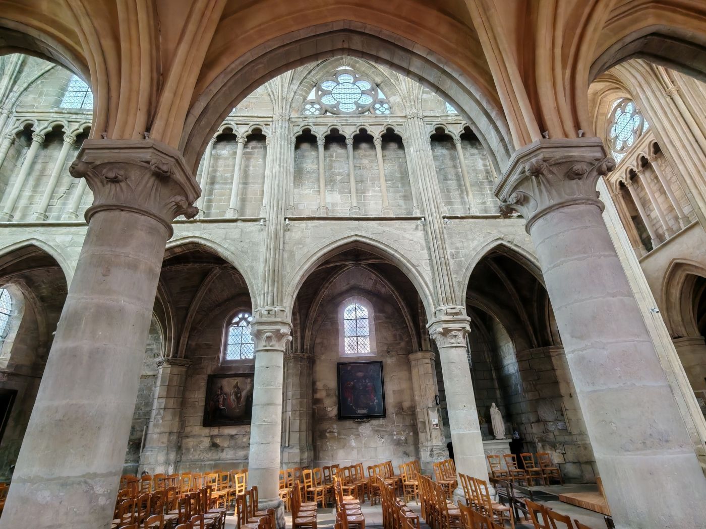 The restoration undertaken in the 16C, with the construction of the choir above the chemin du roy or royal way to provide a pedestrian passage, as provided for by royal edicts, gives it a unique character found in only two other churches in France. It is said that the Sun King, returning from hunting, attended a Mass under this vault, while remaining seated in the saddle of his horse. It should be noted, in passing, that Louis XIV’s nurse was from Triel, which may explain Louis XIV’s presence in this place. When, around the 1550s, it was decided to enlarge the eastern part of the church, it was necessary to respect the “easement” of the public utility road, known as the King’s Road (today rue Galande), the only truly passable road to reach the hamlet of Cheverchemont and the Hautil plateau. Also, after demolishing the 13C apse, it was necessary to span the road with a vault and on the other side to build a crypt to redeem the level and support the new choir. It is accessed by two doors pierced in the underground passage which passes under the church or by a spiral staircase which opens into the choir (currently closed by a slab). A semi-circular corridor, forming an ambulatory, allows one to go around it. This wide corridor is devoid of chapels and is lit by oculi. The central part of the crypt includes, in addition to the spiral staircase, a rectangular room vaulted with a transverse barrel vault divided by two arches. The crypt was easily dated thanks to its characteristic 16C decorations. There are leaf decorations surrounding a fruit, a rose window, a face, on the axial vault there is a coat of arms representing the Instruments of the Passion and on the apse there are three crescents which are the arms of Henry II. The style of this crypt is therefore completely original and must have represented a stylistic exercise to which the Renaissance builders were not accustomed.