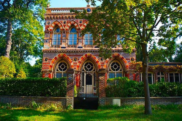 In the heart of the Maisons-Laffitte park stands a facade that seems to be out of another time. The Maison Doulton house,located at 30 Avenue Pascal is its finely sculpted terracotta ornaments, is a vestige of a major historical event: the Universal Exhibition of 1878. This is not a house like the others: its facade has been specially designed for the Universal Exhibition of Paris in 1878. It served as a pavilion to represent England and highlight the excellence of the Doulton & Lampeth factory, specialized in terracotta. Covered with terracotta -sculpted elements, it testifies to the refinement and creativity of the Victorian era. With its large ogival berries and its inspired look of medieval Gothic, the facade of the Doulton house is fully part of the picturesque style of “Gothic revival”. Its terracotta coating and its skillfully worked polychromy illustrate all the know-how of the English manufacturer, transforming this home into a real work of architectural art. It cannot be visited ; you have to be content to admire it from the outside, walking in the Parc de Maisons-Laffitte.