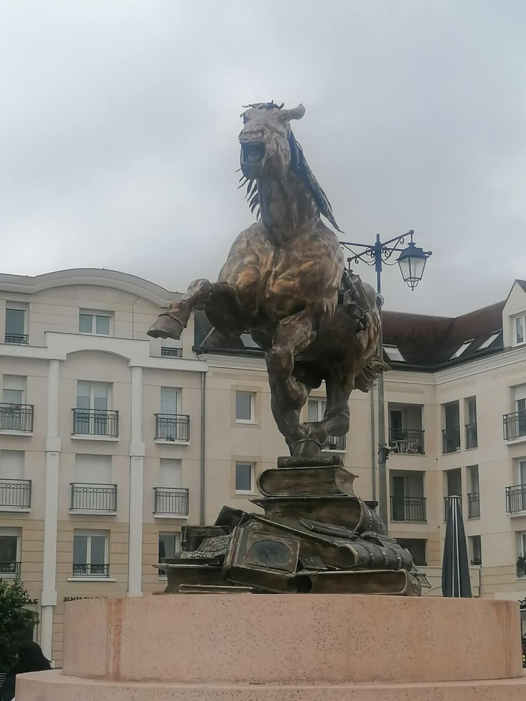 The cheval Ptolémée or Ptolemy horse is a monumental bronze and stainless steel sculpture, located on Place du Maréchal Juin, was donated to the town of Maisons-Laffitte by Dr. Jean-Charles Hachet. The sculpture was installed on the square on August 4, 2021. Located in front of the library, it perfectly illustrates the transmission of knowledge and the love of books, and horse, the City is much attach. Its name was chosen in reference to the Greek Ptolemy dynasty, which ruled Egypt after the death of Alexander, and founded the Library of Alexandria. The horse’s body is laden with works of literature, and the statue was installed next to the library. The statue is 3 meters high and 4.5 meters wide, was initially to be installed in front of the entrance to the racecourse.